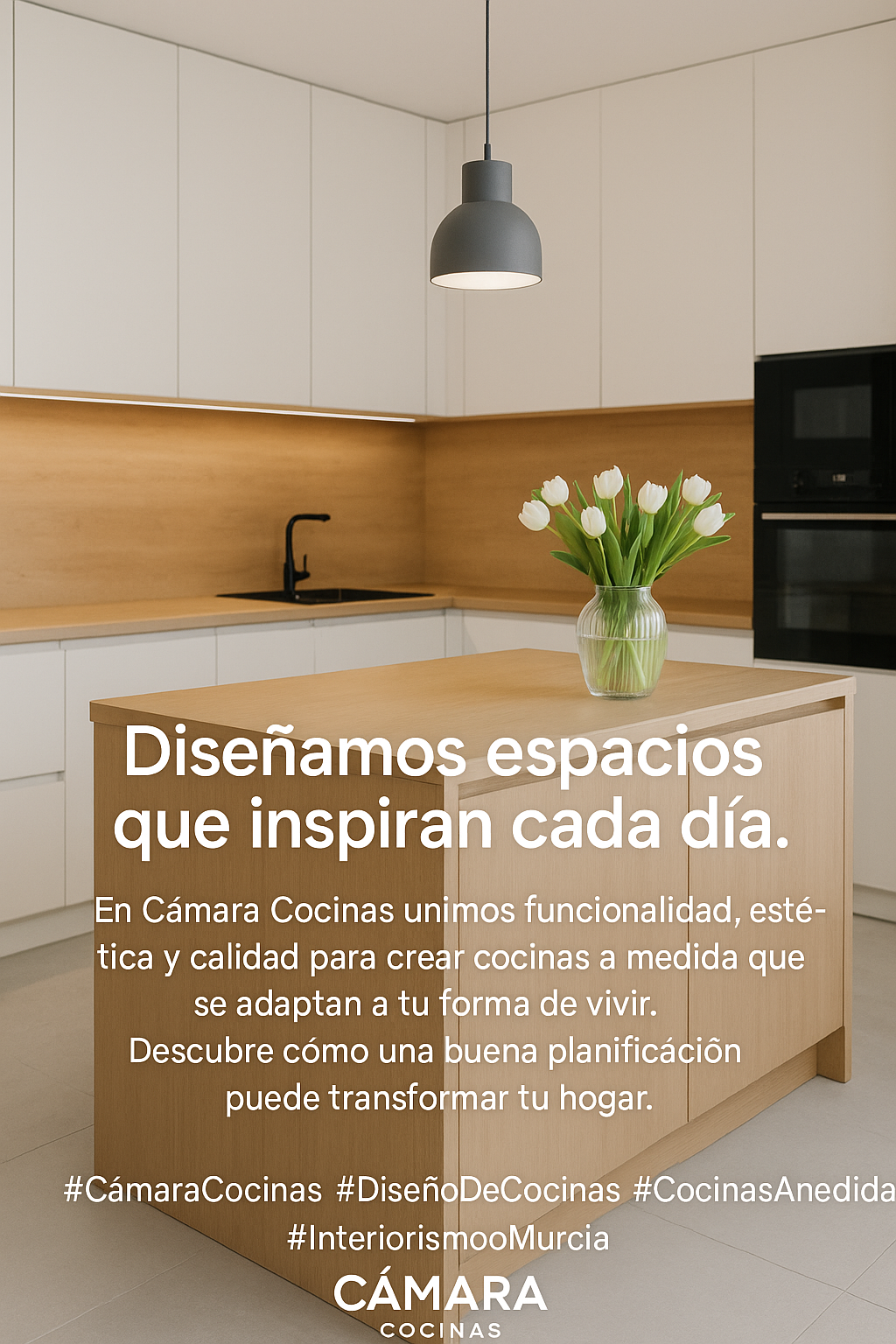 En Cámara Cocinas llevamos más de 45 años diseñando y fabricando cocinas a medida en Murcia, Orihuela y Santomera, con una filosofía clara: ofrecer calidad sin concesiones. No trabajamos con catálogos cerrados, sino con ideas únicas que nacen del diálogo con cada cliente.